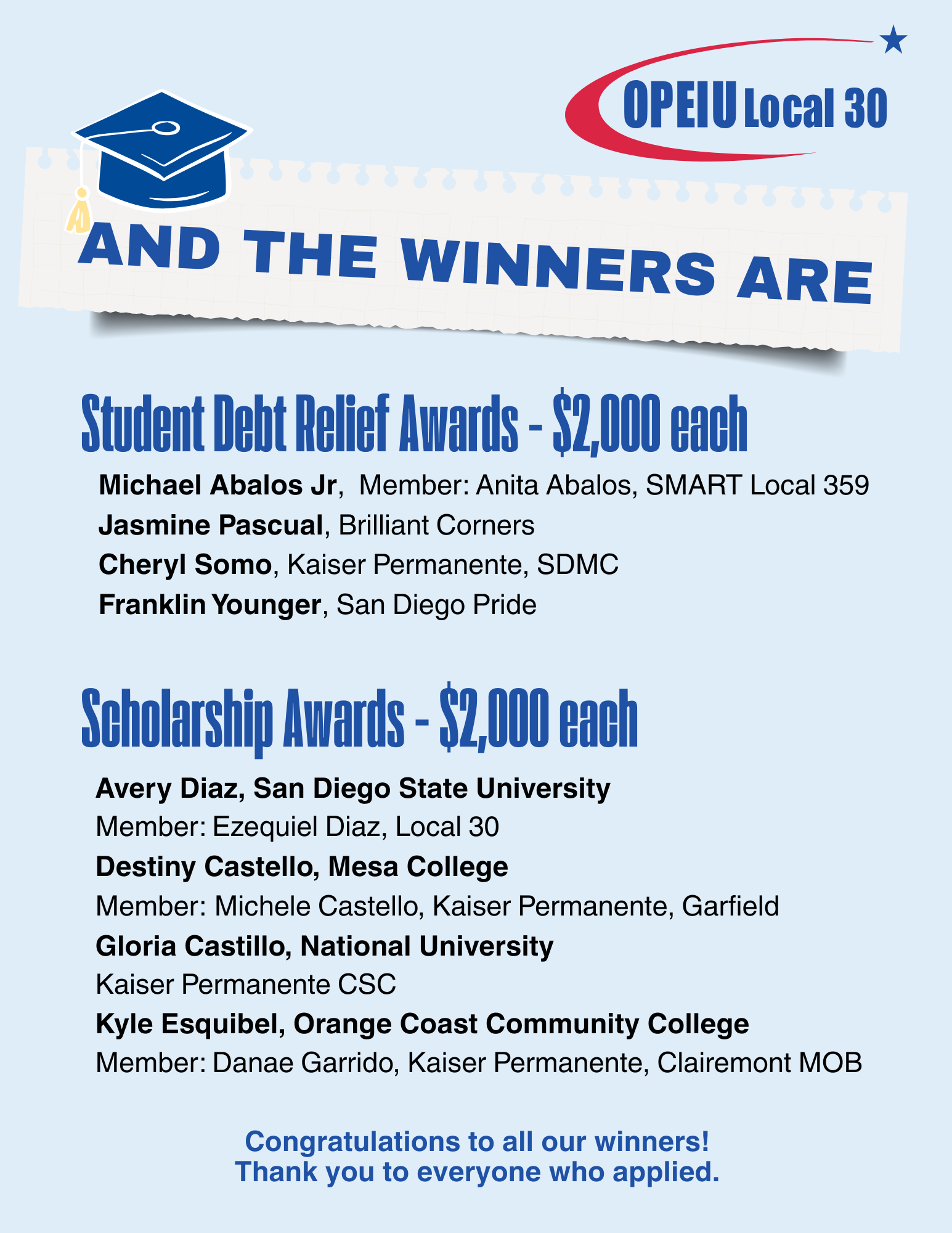 Enclosed please find the scholarship application forms, a copy of the rules, and other information about this program. You are welcome to send in one application for each eligible family member. Acceptance letter or school registration information, or documentation that student loan payments are up to date must be attached to the application and submitted to the Local 30 office by September 30, 2021, to be eligible for the Scholarship drawing. Incomplete applications may be excluded. Please be sure to apply as soon as possible. We will draw the winners at our October General Membership meeting.